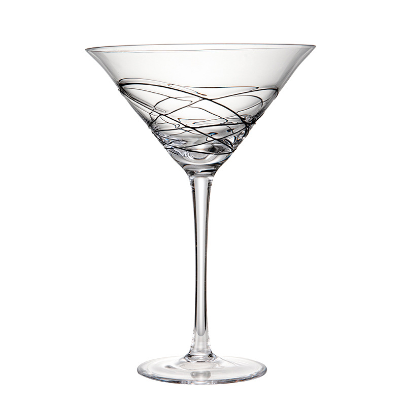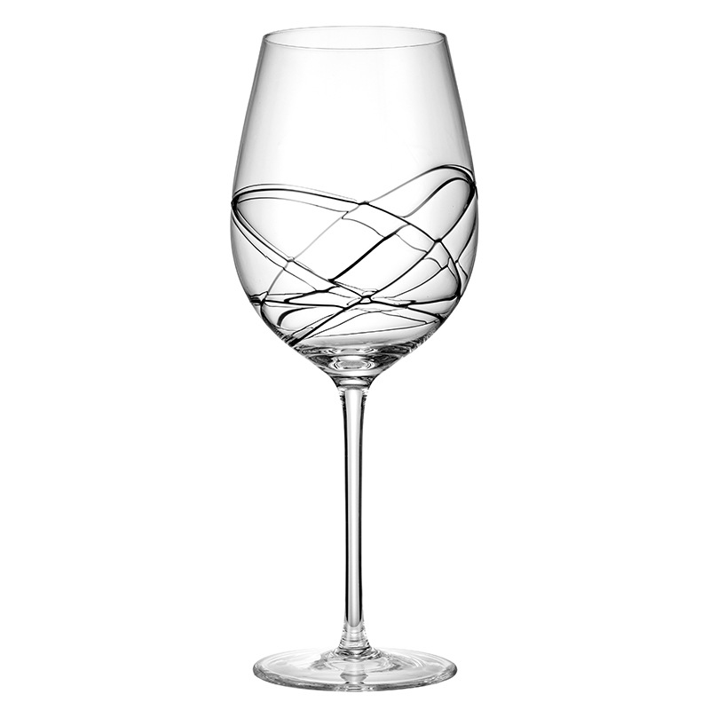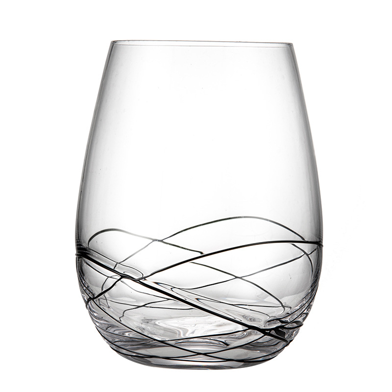The defining feature of these glasses lies in their mesmerizing swirl patterns, which gracefully wrap the lower portion of the bowl. Delicate, hand-applied lines—whether in bold black or subtle metallic hues—create a dynamic interplay of light and shadow, catching and refracting light to add depth and movement. The transparent glass body ensures the rich color of wines shines through, while the textured pattern adds a tactile dimension, enhancing grip and visual intrigue.