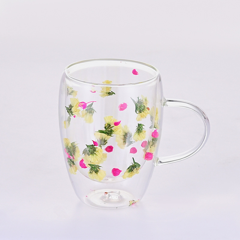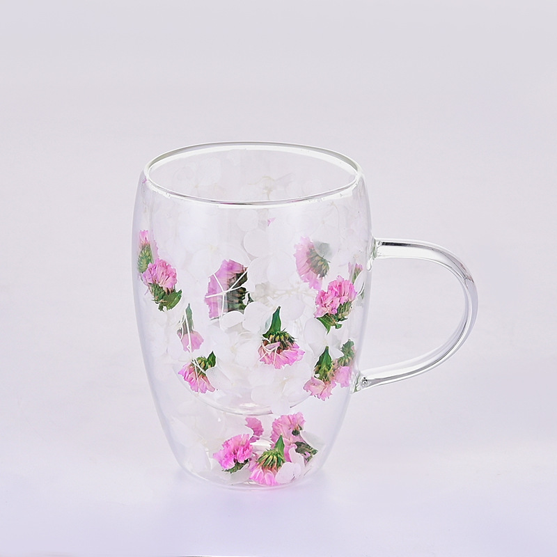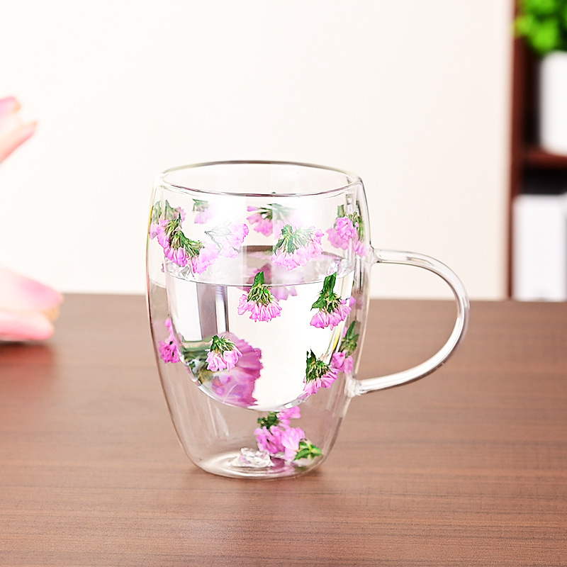 The defining feature lies in the vibrant forget-me-not blooms encapsulated within the double-wall interlayer. Delicate petals in shades of purple, pink, white, and yellow, complemented by lush green foliage, are permanently suspended between the glass layers. As you pour hot or cold drinks, the flowers appear to float gently, creating a mesmerizing 3D effect that adds a touch of nature-inspired charm to your tabletop. The transparency of the borosilicate glass enhances this illusion, making the blooms seem suspended in mid-air, turning each use into a visual delight.