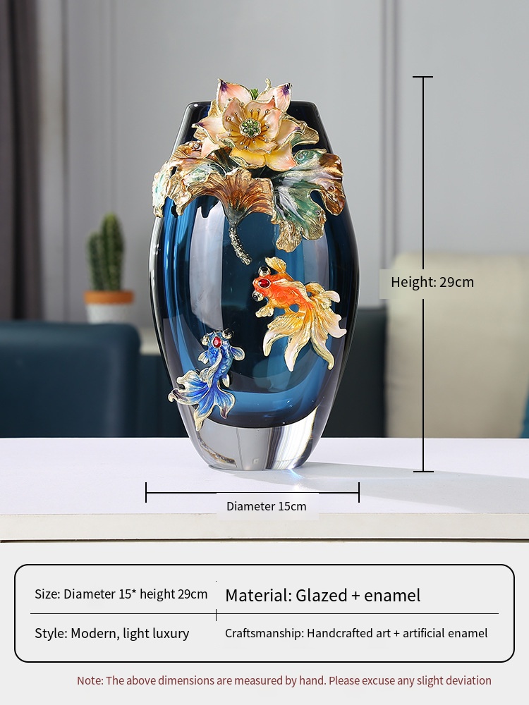 - Vibrant Koi Fish: Playful koi in fiery orange and iridescent blue glide beneath the lotus, their scales rendered in shimmering enamel. Tiny red crystal eyes catch the light, creating a lifelike illusion of movement, as if the fish swim through tranquil waters within the glass.