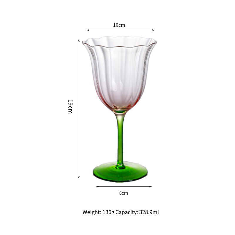 The gradient color story is a romantic blend of pink and green, hand-applied to flow seamlessly from rim to base. Starting with a soft blush pink at the petal-edged rim—evoking cherry blossoms or rose buds—the color deepens gradually into mint green at the bowl, then transitions to rich emerald at the stem and base, mimicking the way flower stems fade from bloom to leaf. The effect is dynamic yet serene: in sunlight, the gradient shimmers with iridescent hints, while under warm lighting, it glows with a cozy, garden-inspired warmth. Each hue is infused into the crystal glass, not painted, ensuring the color won’t chip or fade—even with regular use.