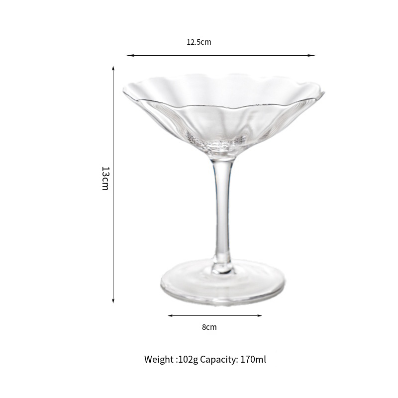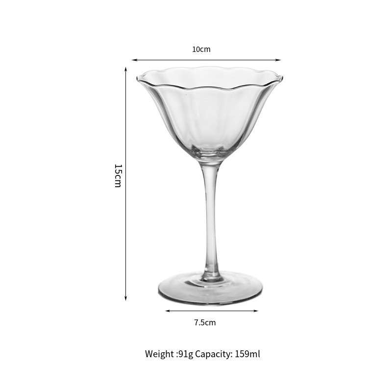 Every glass in the set features a rim shaped to resemble gently unfurling flower petals—subtle yet striking, adding a touch of organic whimsy without overwhelming the design. Imagine a rim with delicate, rounded indentations that mimic the curves of rose or peony petals, each “petal” polished to a smooth, glossy finish that catches light like dewdrops. The petal details are most pronounced on coupe and martini glasses, where the wide rim becomes a canvas for the floral motif, while champagne flutes and wine glasses feature more understated petal edges, balancing elegance with practicality. When filled, the petals frame the drink, turning a simple pour into a “blooming” centerpiece—think a champagne flute with petal rim making bubbles look like they’re rising through a flower, or a wine glass where the petal edges cradle red wine like a bloom holding nectar.