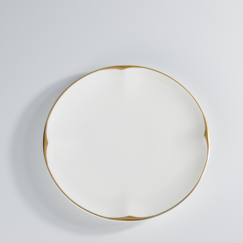 - Plates: Feature a gently curved, shallow profile with a wide, flat rim that showcases the gold trim. The edges are slightly raised to contain sauces, while the center is smooth and expansive, ideal for plating mains or appetizers.