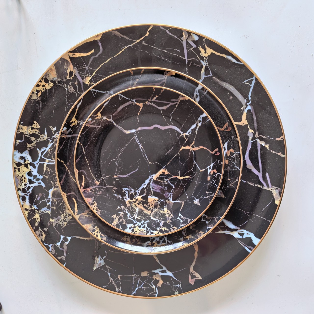 Our ceramic plate is a true masterpiece that combines elegance and functionality. With its luxurious marble pattern in black, gold, and hints of purple, this plate is not just a dining essential but also a stylish decor piece for your table setting.