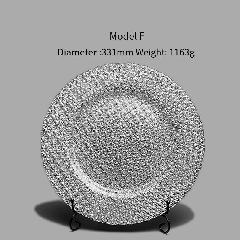 Elevate your tabletop to new heights of sophistication with our exquisitely crafted glass charger plates, where artisanal texture meets timeless luxury. Forged from premium glass, each plate boasts a mesmerizing textured surface and a choice of three opulent hues, designed to transform ordinary dining settings into extraordinary experiences. With six distinct patterns and versatile appeal, these charger plates blend functionality with artistic flair, making them a staple for both formal events and everyday elegance.