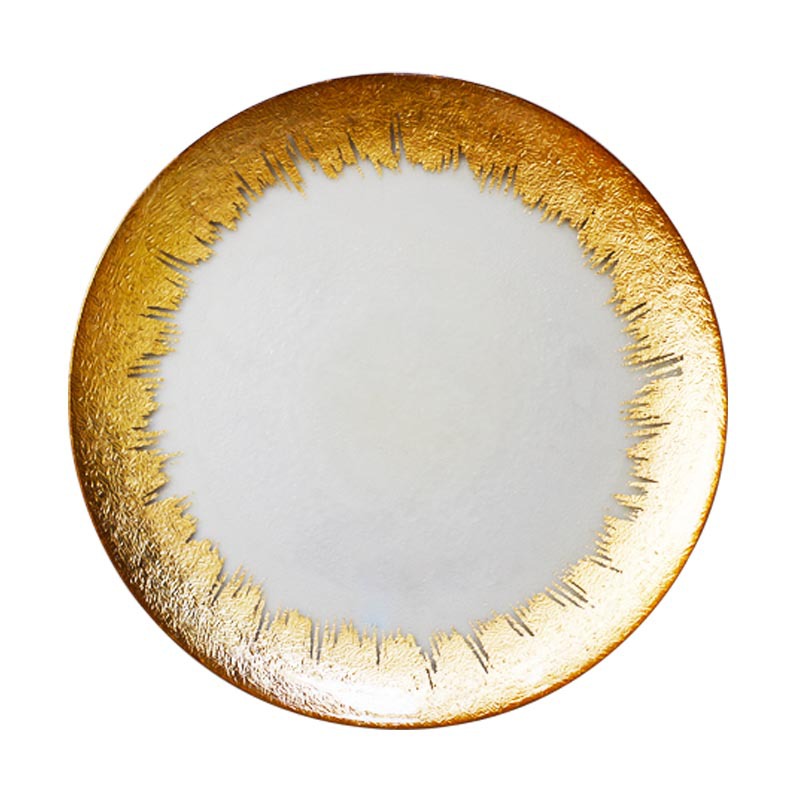 The collection celebrates the duality of metallic elegance, with each variant offering a unique mood to suit diverse settings:- Gold-Rimmed Crystal Glass Plates: A clear crystal glass base is framed by a thin, polished gold rim that wraps gently around the plate’s edge. The gold is applied via advanced electroplating, resulting in a smooth, mirror-like finish that catches light with warm radiance—think the soft glow of candlelight reflecting off a gilded frame. The rim itself is precisely 3mm wide, striking the perfect balance between subtlety and statement: bold enough to define the plate’s silhouette, yet delicate enough to let the glass’s clarity shine through. The transition from gold rim to clear glass is seamless, with no visible seams or uneven edges, creating a cohesive look that feels both intentional and effortless. Ideal for adding warmth to traditional dining rooms, holiday tablescapes, or romantic dinners.