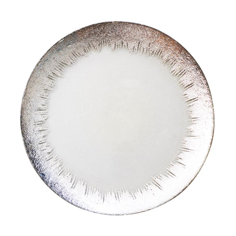 - Silver-Rimmed Crystal Glass Plates: For modern minimalism, these plates feature a sleek silver rim that contrasts crisply with the clear glass base. The silver has a cool, chrome-like luster, achieved through a multi-step plating process that ensures uniformity and durability. Unlike the gold’s warmth, the silver leans into contemporary coolness—its neutral tone complements bold table linens, vibrant food presentations, or monochromatic decor. The rim here is slightly thinner (2.5mm) than the gold variant, emphasizing the plate’s clean lines and understated appeal. The silver’s high-shine finish reflects light with a subtle brilliance, making it a versatile choice for everyday use, corporate events, or minimalist-inspired restaurants.
