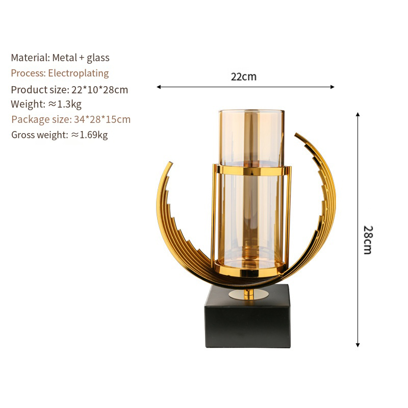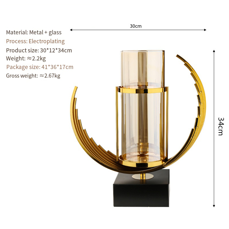 What defines this vase is its sculptural metal framework—a fluid, crescent-shaped arc composed of gracefully curved parallel lines. The gold-toned metal wraps around the glass, creating a sense of movement and balance, as if cradling moonlight itself. This design embodies the timeless “Flower & Full Moon” symbolism, representing harmony, prosperity, and life’s cherished moments. A sturdy black rectangular base grounds the piece, offering bold contrast to the gold accents and enhancing its modern minimalist appeal.