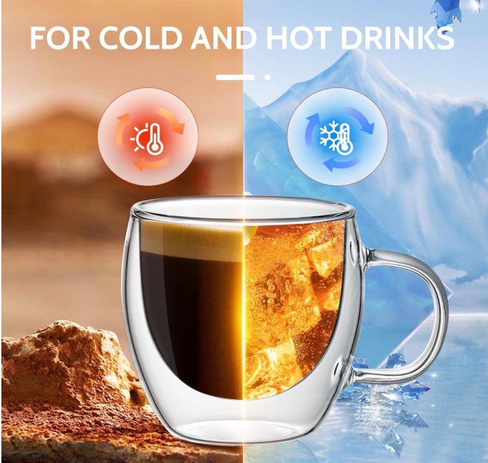 The 2-layer glass cup has a cool touch, keeping the beverage hotter or colder than regular glass or ceramics.