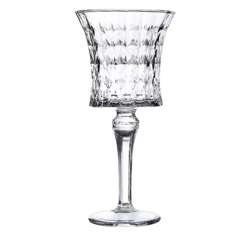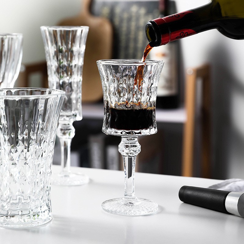 The goblet’s defining allure lies in its meticulously carved diamond-patterned bowl, where precision-cut facets create a geometric interplay of lines and angles. Each facet is etched with architectural precision, adding depth, texture, and a tactile dimension that catches light from every angle, resulting in a prismatic display of shimmer. The bowl flares gently at the rim, enhancing aeration for wines and cocktails while framing the diamond motif as a focal point of artisanal craftsmanship.