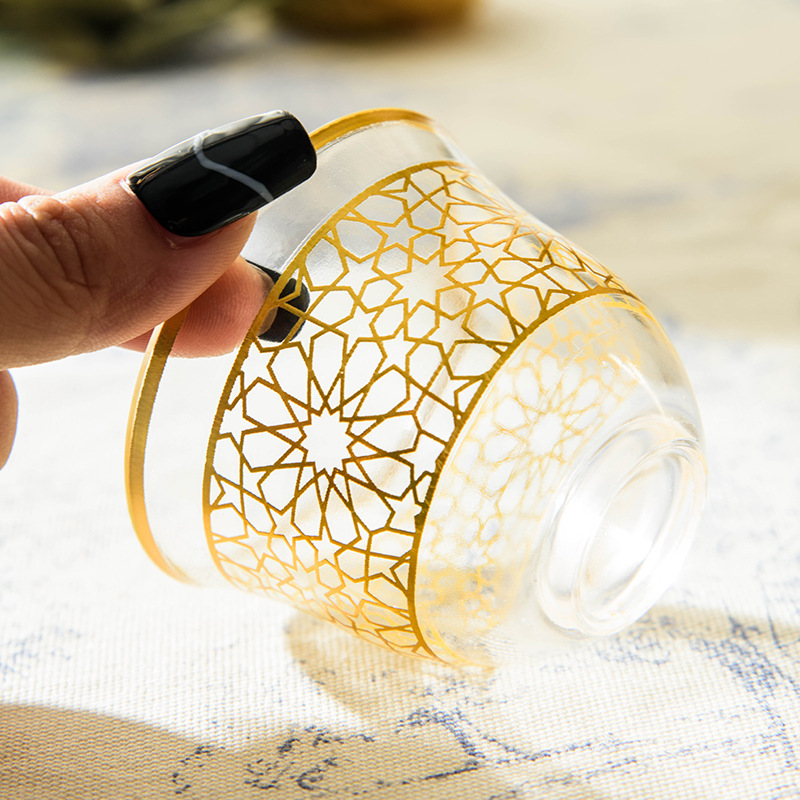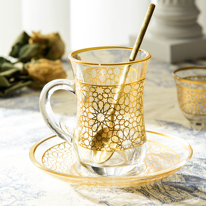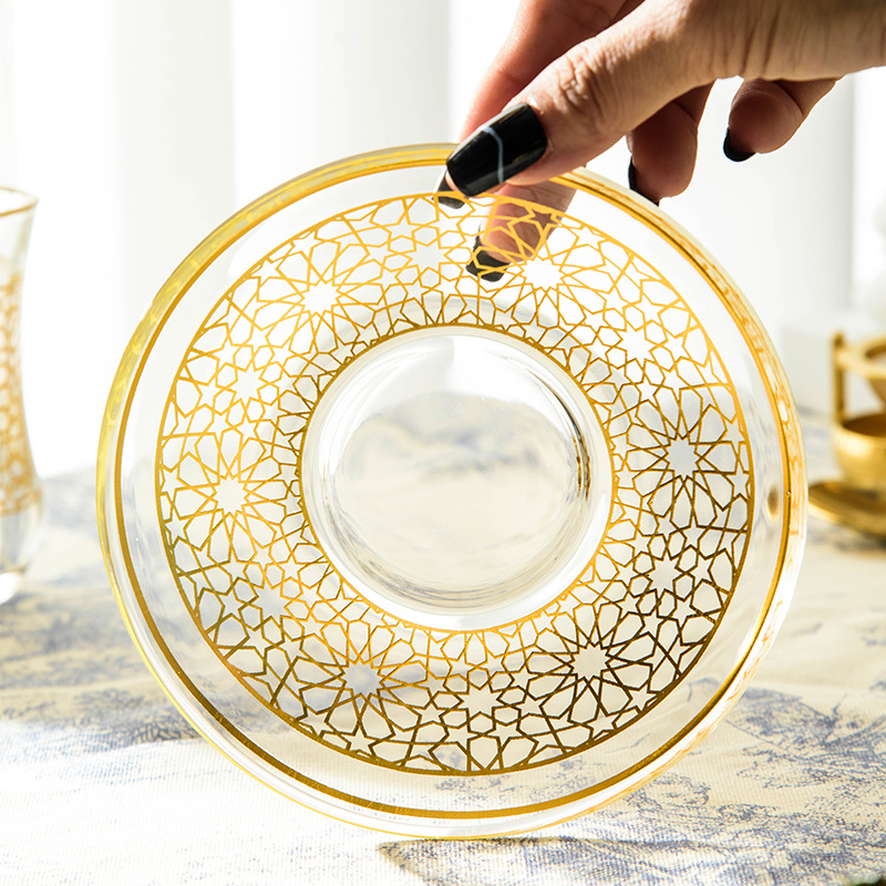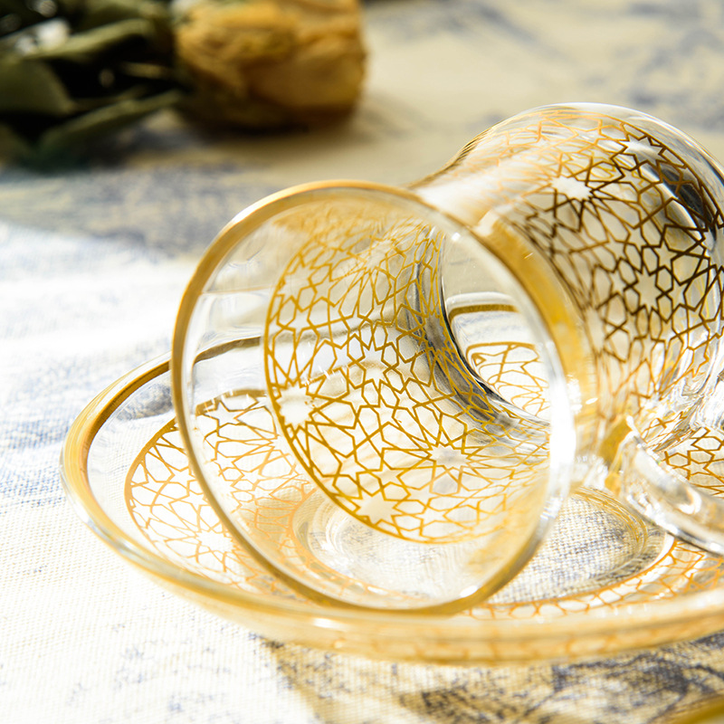 - Artisanal Motifs: Skilled artisans create intricate designs—ranging from delicate floral scrolls to elegant geometric borders—that wrap gracefully around the cup’s exterior (from base to just below the rim) and frame the saucer’s perimeter. Each pattern is bonded to the glass via a high-temperature firing process, ensuring long-lasting shine without fading or peeling.