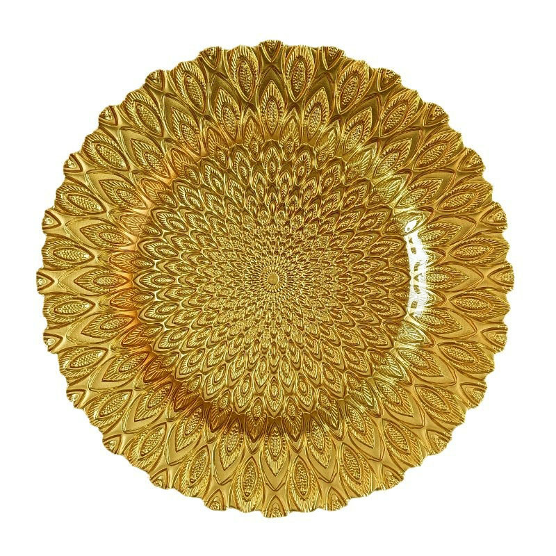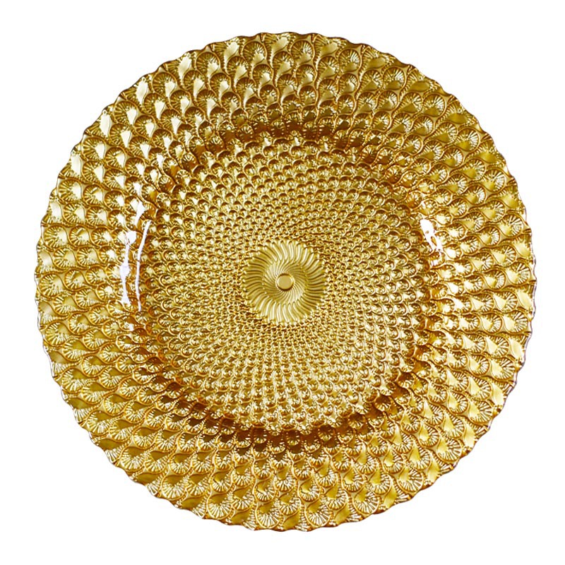 - Solid Gold Peacock Feather Plates: Understated opulence defined by a clear glass base and all-over gold feather patterns. The feathers here are small and densely packed, creating a textured, mosaic-like effect. The gold has a warm, satin finish that softens its shine, making these plates versatile enough for everyday use or formal occasions.