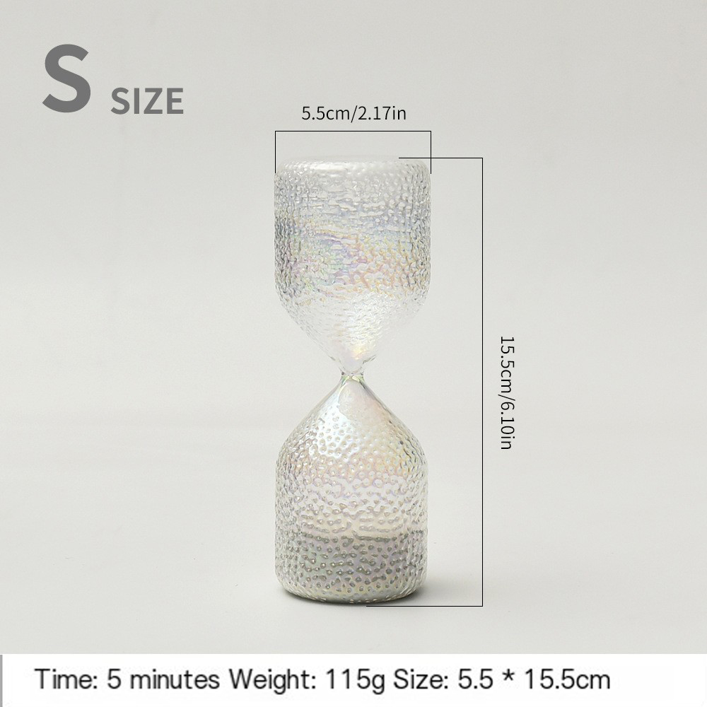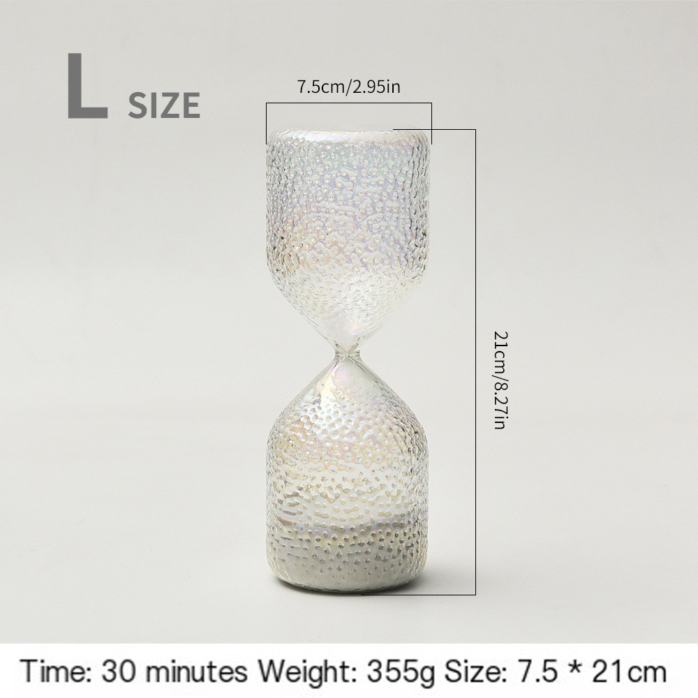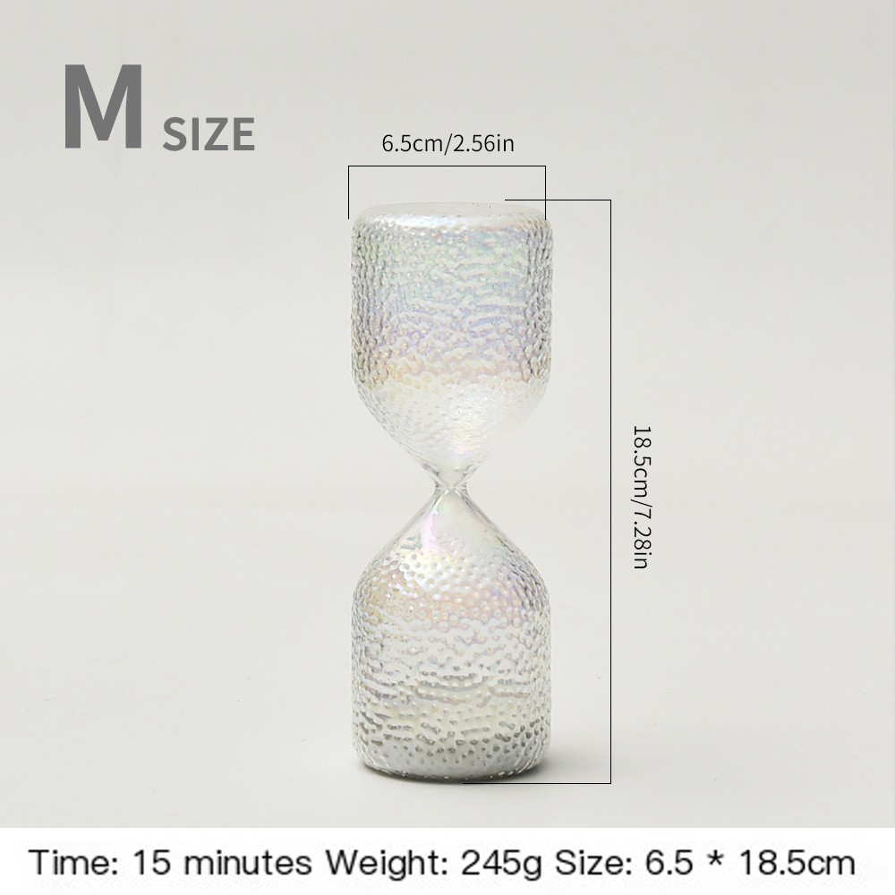 Elevate your space with our exquisitely crafted hourglass, where functional timekeeping meets artistic brilliance. Forged from premium borosilicate glass, this piece blends exceptional clarity, durability, and a mesmerizing iridescent finish, transforming the passage of time into a captivating visual experience.