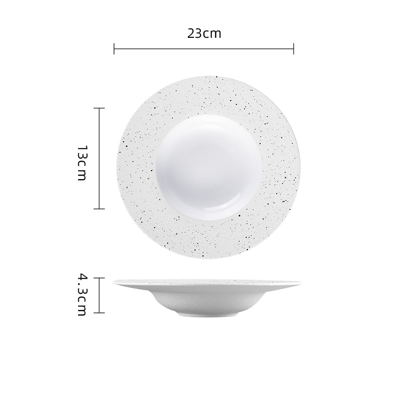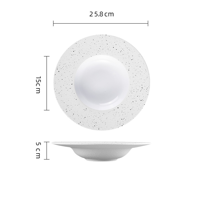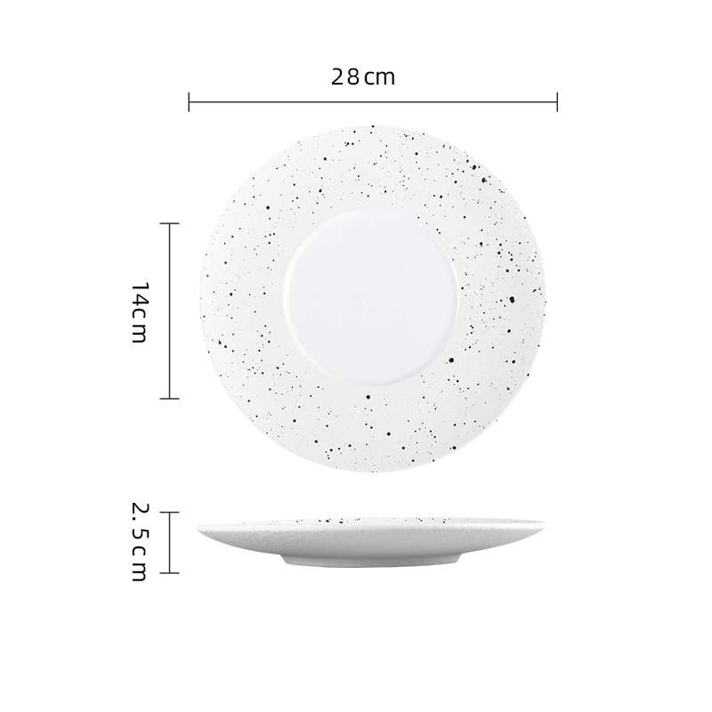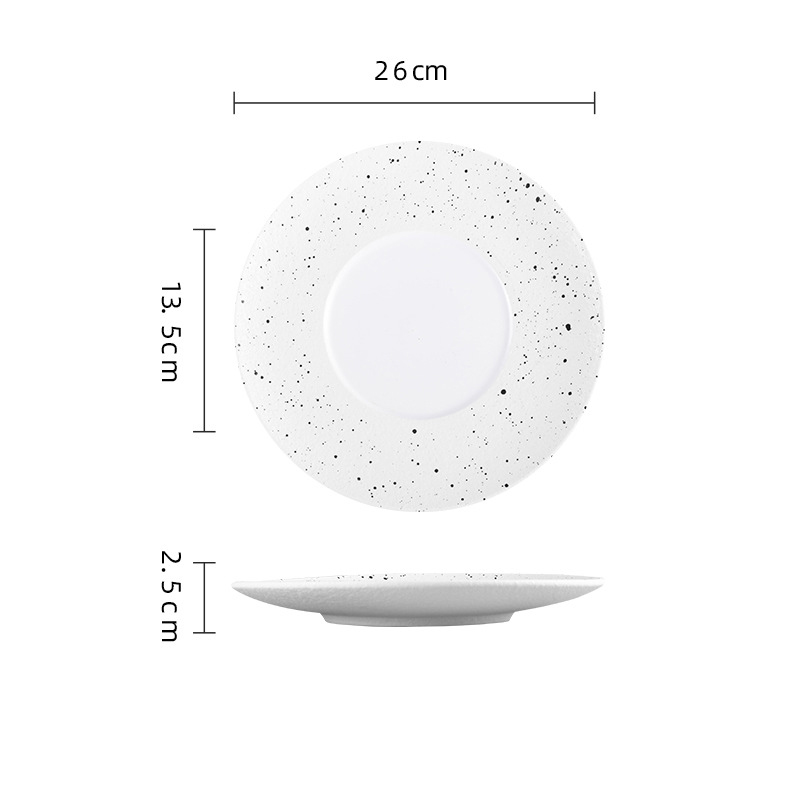 Each plate’s outer surface is hand-finished with a scatter of black speckles, applied using artisanal techniques to ensure a natural, non-uniform pattern that feels both intentional and effortless:- Speckle Texture: The dots vary in size—from pinhead-small to pea-sized—and are distributed in loose, irregular clusters, mimicking the look of hand-splattered ink or natural mineral deposits. Applied before glazing, they sit slightly raised from the surface, adding a subtle tactile dimension that invites touch. The base color of the exterior is a soft, neutral tone (ivory, light gray, or warm beige), allowing the black speckles to pop without overwhelming.