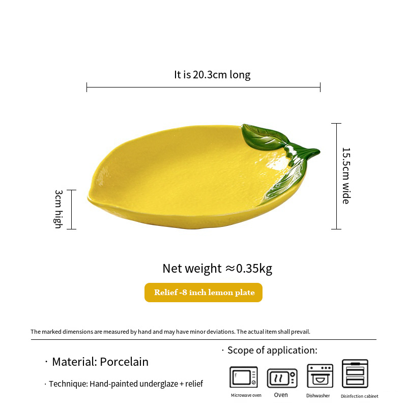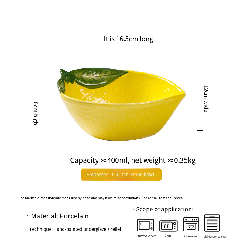 Curved to mimic half-sliced lemons, the plates feature textured rind patterns that replicate the natural dimples of ripe citrus. A delicate hand-painted green leaf adorns the rim, adding a 3D tactile element that catches light and elevates presentation. The smooth, glossy glaze enhances the vibrant yellow hue, making salads, appetizers, or desserts pop with freshness. - Embossed Bowls