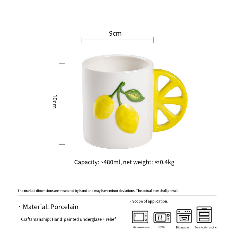 Ergonomic and comfortable, the mugs boast two charming designs: some feature hand-painted lemon illustrations with green leaves, while others highlight relief lemon slices wrapping around the body. The handle, cleverly shaped like a curved lemon wedge, offers a secure grip and playful accent that ties the set together.