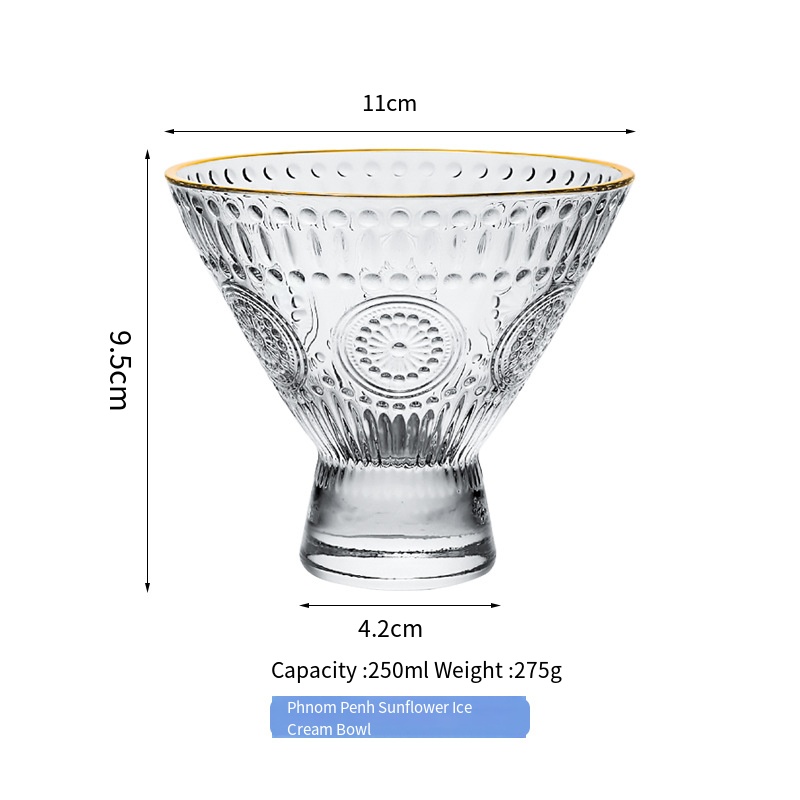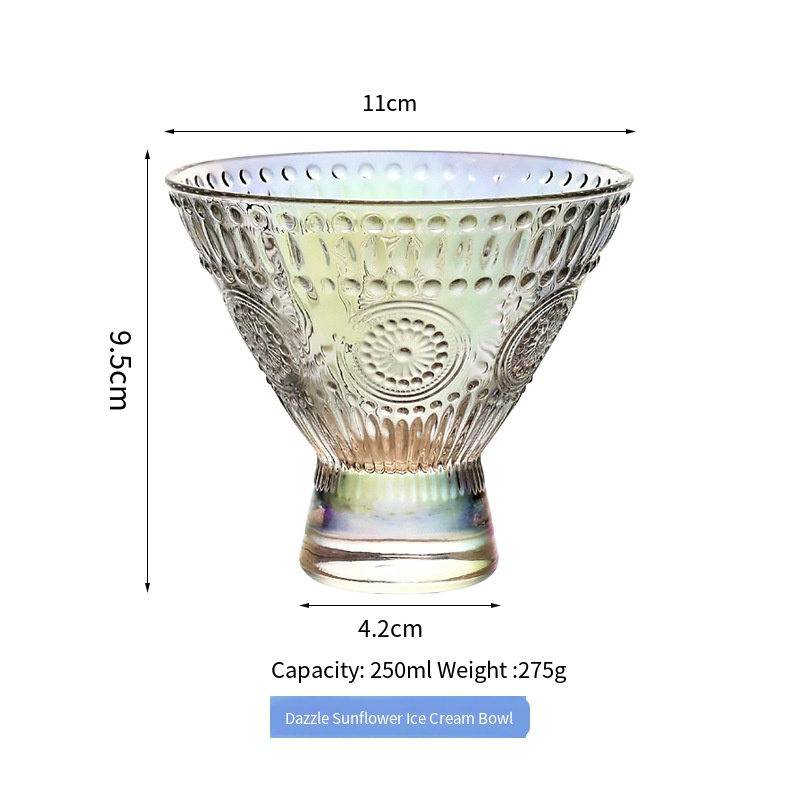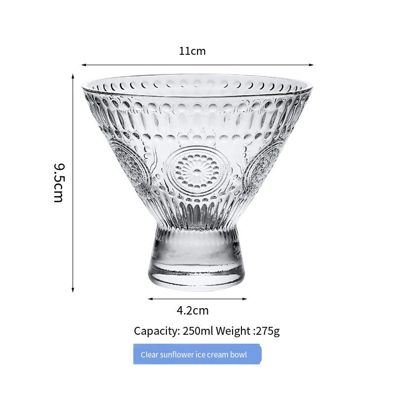 The bowl’s surface is brought to life with two distinct pressed textures, each adding depth and light-catching dimension:- Sunflower Motif: A delicate, radiating pattern inspired by sunflower petals, pressed into the glass with microscopic precision. The design features concentric circles of fine, curved grooves that emanate from the bowl’s base, creating a sense of movement—when light hits the glass, the grooves scatter rays, mimicking sunlight filtering through petals.