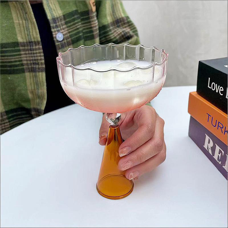 Elevate your barware with our triangular cone-stemmed cocktail glasses, where geometric precision meets luminous color—crafted from high borosilicate glass to blend modern architectural design with playful vibrancy. Designed for those who crave bold, sculptural elegance, this dual-color collection reimagines the classic cocktail silhouette: a sleek, tapered bowl perched atop a striking triangular cone stem, available in two eye-catching hues—deep emerald green and warm amber orange. The result is a glass that feels both futuristic and refined: the angular, pyramid-like stem adds structural drama, while the vibrant, translucent glass shimmers with light, turning every drink into a visual spectacle. Whether serving zesty margaritas, tropical daiquiris, or signature cocktails, these glasses merge artistry with functionality, making them perfect for home bars, themed events, and contemporary venues.
