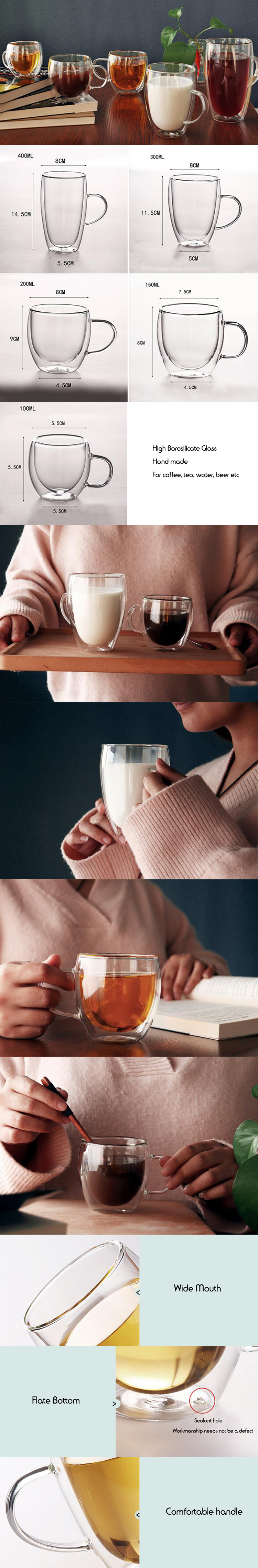 Wholesale customized logo large 350ml clear borosilicate insulated double wall glass coffee tea cups mugs with handle